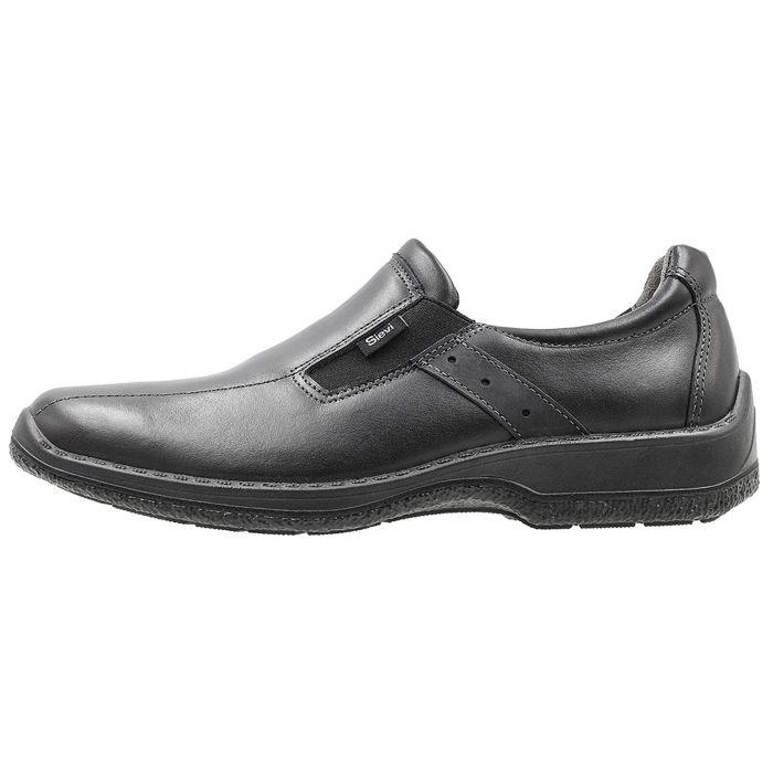 Als bovenmateriaal zwart nerfleer, dat goed vormvast en waterafstotend is. Opzij rekbanden die het aan- en uittrekken vergemakkelijken. De verende Flexstep®-zool is vervaardigd van polyurethaan en dempt op de rug en voeten gerichte schokken. De losse Sievi Comfort-inlegzool is antistatisch, voldoet aan de ESD-normen, is machinewasbaar (40 ˚C) en ademend. ESD-goedgekeurd.